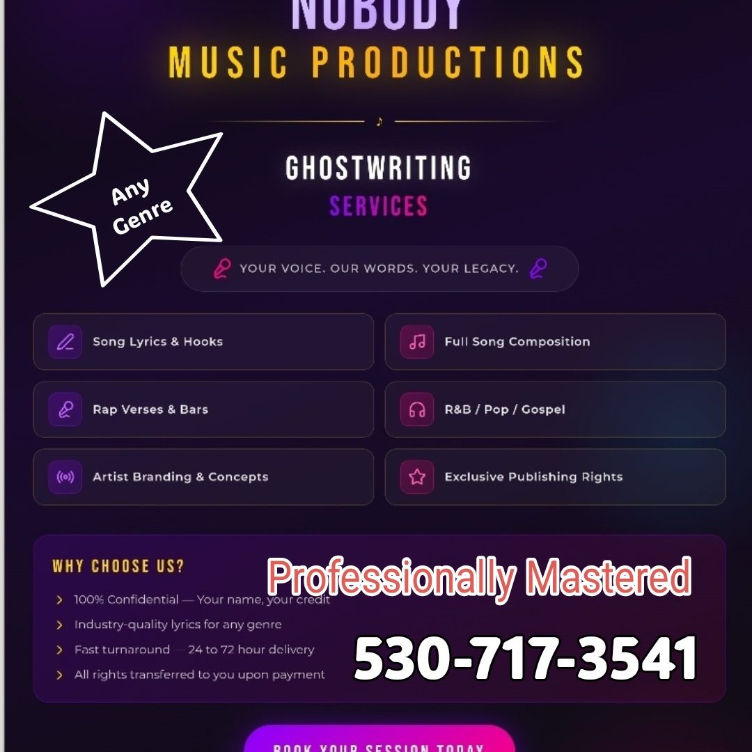Nobody Music Productions was founded to empower musicians with professional ghostwriting services tailored to their artistic vision. We believe every artist deserves authentic, creative songs that resonate, backed by flexible purchasing and royalty options to suit diverse needs.